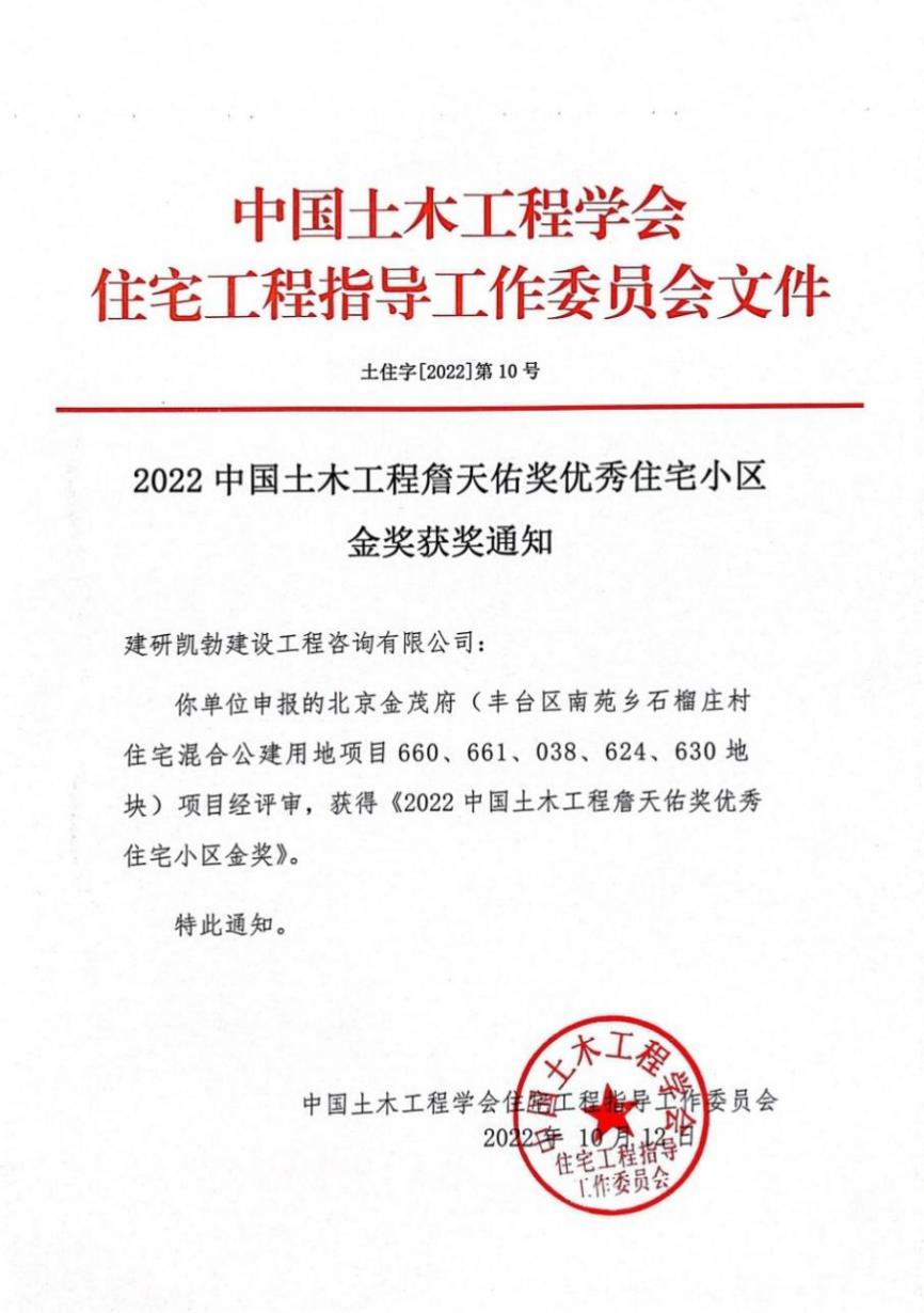 近日,中國土木工程學(xué)會住宅工程指導(dǎo)工作委員會公布了“2022中國土木工程詹天佑獎優(yōu)秀住宅小區(qū)金獎”評選結(jié)果,建研凱勃公司監(jiān)理的“北京金茂府(豐臺區(qū)南苑鄉(xiāng)石榴莊村住宅混合公建用地項目660、661、038、624、630地塊)”工程榮獲“2022中國土木工程詹天佑獎優(yōu)秀住宅小區(qū)金獎”。