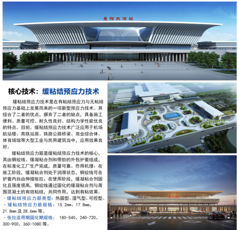 在我國鐵路、航空、公路等交通行業(yè)事業(yè)蓬勃發(fā)展的進(jìn)程中,中技集團(tuán)作出了積極貢獻(xiàn),一是積極參與40余座高鐵客站建設(shè),如北京豐臺(tái)南站、北京朝陽站、北京副中心站、北京大興站,“一帶一路”中緬鐵路緬甸萬象站,川藏鐵路澤當(dāng)站、林芝站,中國第四代鐵路客站杭州西站、廣州白云站等,樹立了“中技預(yù)應(yīng)力”優(yōu)質(zhì)品牌。二是高度重視預(yù)應(yīng)力技術(shù)標(biāo)準(zhǔn)的升級(jí),先后編制發(fā)布或在編多部預(yù)應(yīng)力相關(guān)標(biāo)準(zhǔn),如《大直徑緩粘結(jié)預(yù)應(yīng)力鋼絞線》、《濕氣型緩粘結(jié)預(yù)應(yīng)力鋼絞線》、《濕氣型緩粘結(jié)預(yù)應(yīng)力鋼絞線專用粘合劑》、《公路橋梁緩粘結(jié)預(yù)應(yīng)力混凝土結(jié)構(gòu)技術(shù)指南》、《緩粘結(jié)預(yù)應(yīng)力錨桿錨樁技術(shù)規(guī)程》、《超高強(qiáng)預(yù)應(yīng)力鋼絞線》等。三是高效推進(jìn)預(yù)應(yīng)力科研成果轉(zhuǎn)化,創(chuàng)造了多個(gè)“國內(nèi)首個(gè)”,先后實(shí)施了國內(nèi)首個(gè)大直徑緩粘結(jié)預(yù)應(yīng)力技術(shù)應(yīng)用項(xiàng)目(高鐵安順西站站前廣場,2016年),國內(nèi)首個(gè)濕氣型緩粘結(jié)預(yù)應(yīng)力技術(shù)應(yīng)用項(xiàng)目(阜陽西站站前廣場,2018年),國內(nèi)首個(gè)緩粘結(jié)預(yù)應(yīng)力錨桿技術(shù)應(yīng)用項(xiàng)目(南海體育中心,2020年),國內(nèi)首個(gè)緩粘結(jié)預(yù)應(yīng)力抗浮樁技術(shù)應(yīng)用項(xiàng)目(化龍安置區(qū)工程,2020年),國內(nèi)首個(gè)超高強(qiáng)預(yù)應(yīng)力技術(shù)應(yīng)用項(xiàng)目(廈門新體育中心,2021年)。