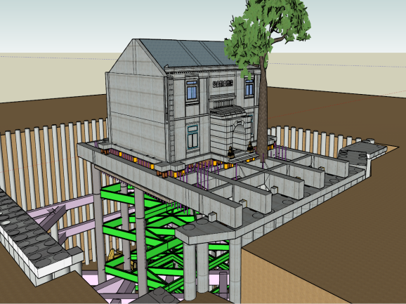 該建筑原為公安部辦公樓,始建于民國時期,是西城區(qū)重點(diǎn)保護(hù)文物。建筑占地面積約400平方米,東西長約15米,南北長約14米,地上兩層,地下基坑深度達(dá)20米。在該地塊開發(fā)過程中,需在建筑周邊及下方進(jìn)行基坑開挖,同時西側(cè)地鐵19號線太平橋站B口的施工也在同步進(jìn)行。為確保歷史建筑的安全,項(xiàng)目團(tuán)隊(duì)對其進(jìn)行了原址托換處理。