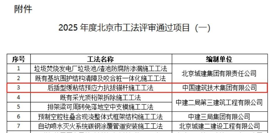 近日,由中國建技申報的“后插型緩粘結(jié)預(yù)應(yīng)力抗拔錨桿施工工法”通過了北京市住房和城鄉(xiāng)建設(shè)委員會組織的北京市工法專家評審,這一成果標(biāo)志著中國建技在技術(shù)創(chuàng)新、施工質(zhì)量和項目管理等方面實(shí)現(xiàn)了新的突破。