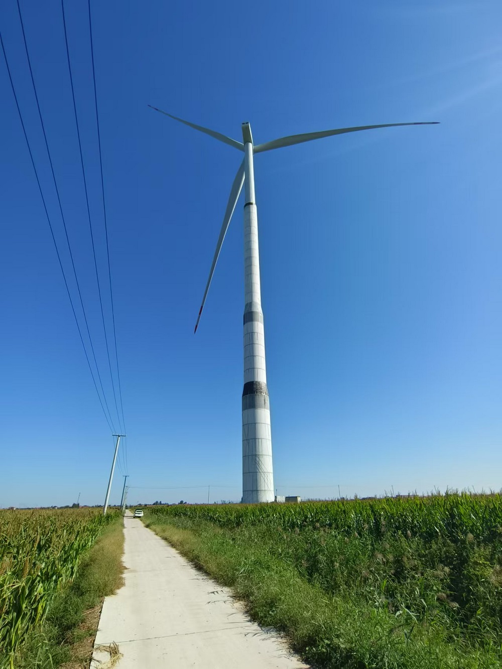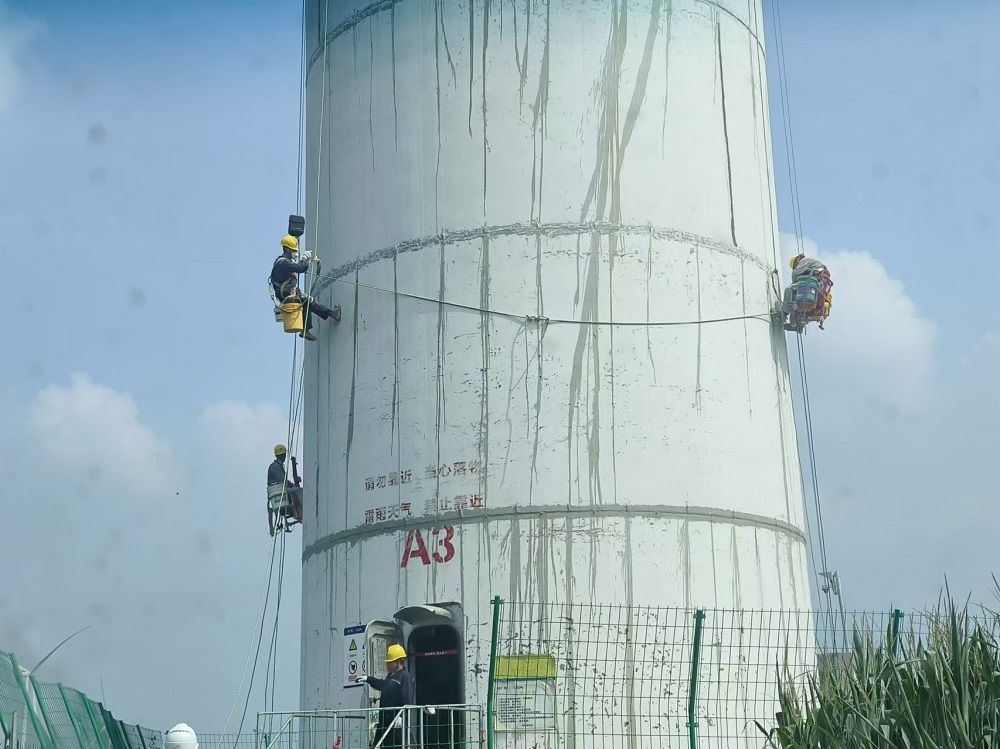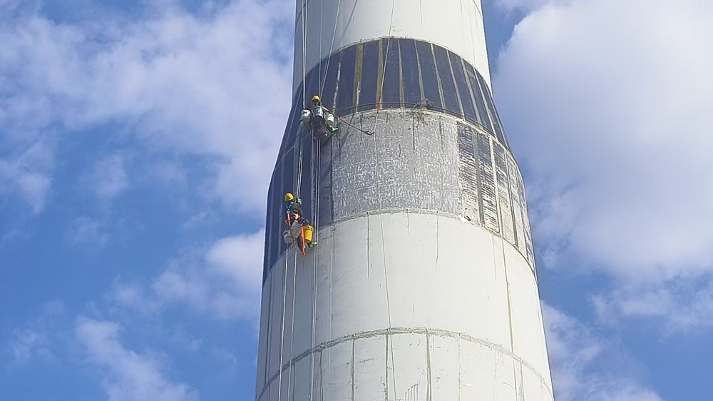 山東省德州市的中廣核慶云尚堂風電場位于山東省德州市慶云縣尚堂鎮(zhèn)。WD195-5000型風電機組,混凝土部分為預制裝配式結構,混塔總高110.03m,共28層。M01~M26高3.99m,M27高3.60m,M28高2.4m。M01~M07外徑7800mm,M09~M14外徑6600mm,M16~M28外徑5400mm,M08、M15為過度節(jié)段。除門洞位置外,M01管片壁厚為300mm,M02~M27管片底部壁厚300mm,M28管片底部壁厚1050mm。M01~M15各由兩個C型管片組成,通過豎縫插筋連接并灌漿,組成完整O型管片。管片M16~M28為完整的預制O型管片。我單位需對塔筒節(jié)間縫隙重新補膠,并對個別塔進行空鼓、掉塊及裂縫進行修復。