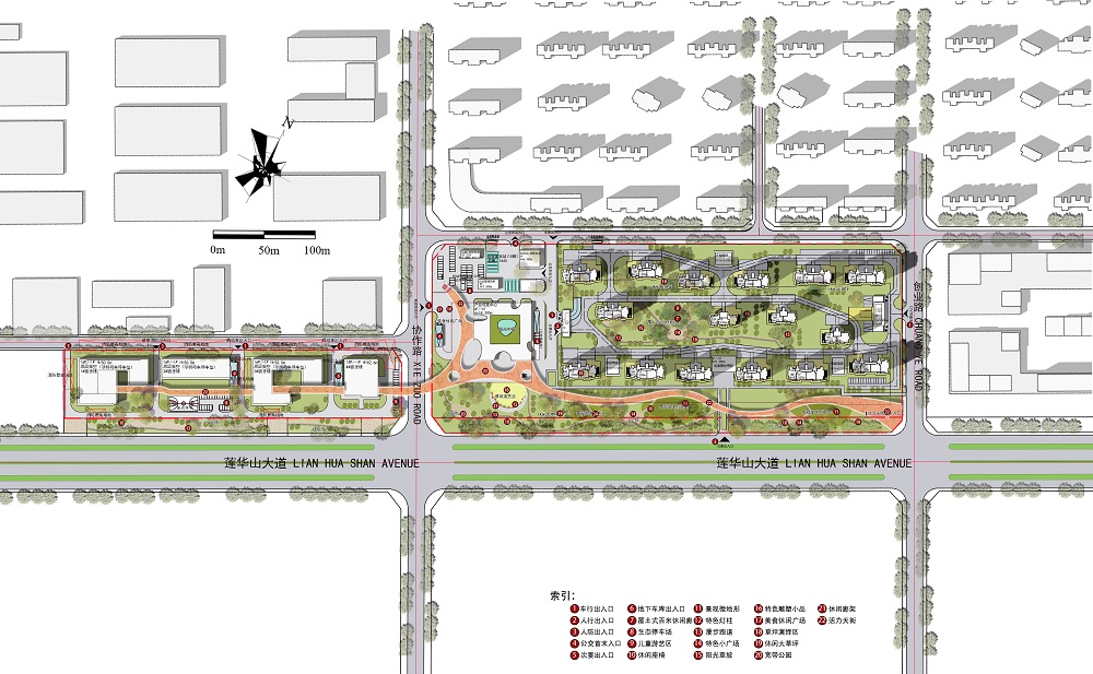 通過調(diào)研分析,提出【都市綠洲、活力天街、靈動(dòng)空間】三個(gè)設(shè)計(jì)理念,著力打造五大特色場景: