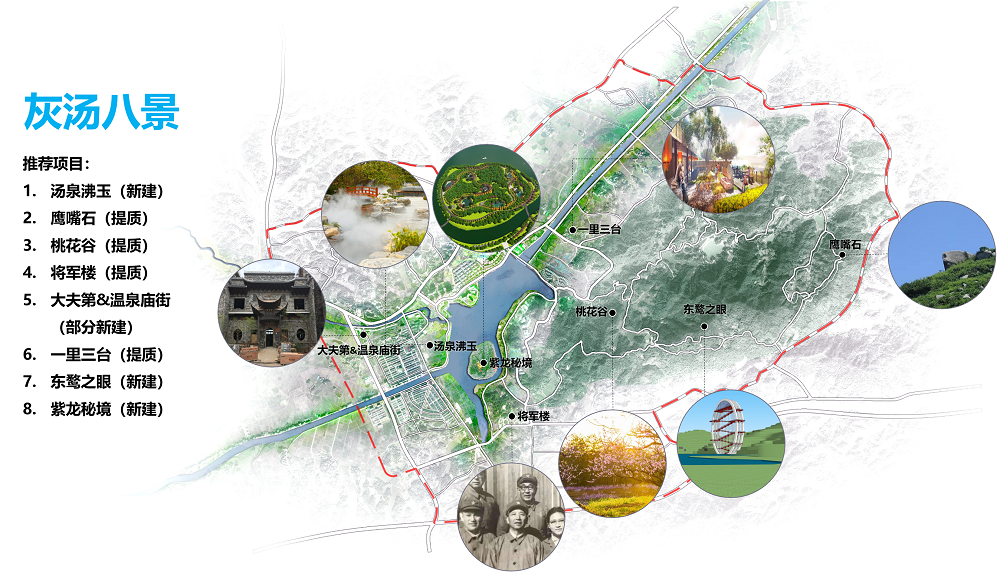 2.1.溫泉保護(hù)與利用:在合理溫泉開發(fā)的基礎(chǔ)上,通過泡溫泉、游溫泉、戲溫泉、吃溫泉、賞溫泉等活動結(jié)合灰湯山水文化、民俗文化、美食文化打造全國溫泉品類最多、體驗感最強的溫泉度假區(qū)。