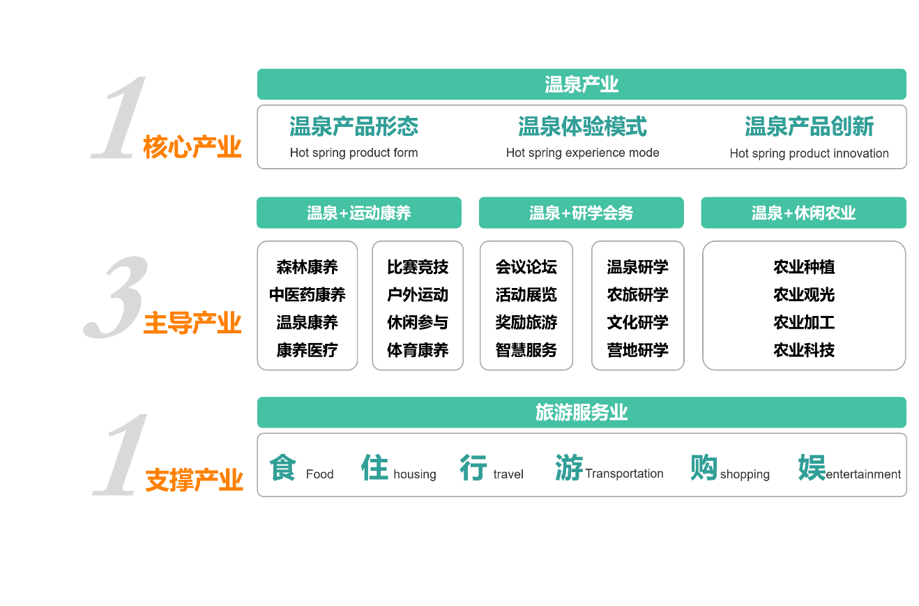 以“溫泉”為核心,以“溫泉+運動康養(yǎng)”、“溫泉+研學(xué)會務(wù)”、“溫泉+休閑農(nóng)業(yè)”為三大主導(dǎo)產(chǎn)業(yè)以旅游服務(wù)業(yè)為支撐,構(gòu)建“1+3+1”的產(chǎn)業(yè)體系。