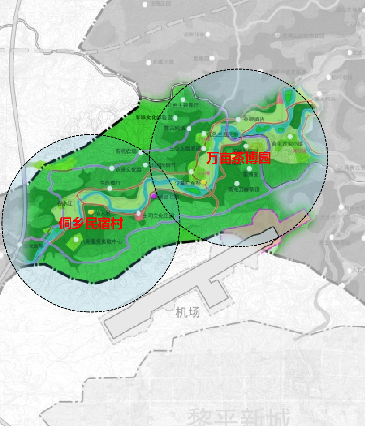 項目地處湘、黔、桂三?。▍^(qū))交界的侗鄉(xiāng)腹地,黎平侗鄉(xiāng)風(fēng)景名勝區(qū)北部,以八舟河、天生橋景區(qū)為核心,基地南北長11600米,東西長14400米,總面積約53平方公里。