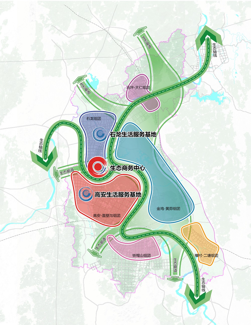 大開(kāi)大合空間結(jié)構(gòu)——著眼于自然生態(tài)特質(zhì),以水為脈、綠為基、路為廊形成大開(kāi)的生態(tài)空間,以高度復(fù)合的產(chǎn)業(yè)功能組團(tuán)形成大合的發(fā)展空間,構(gòu)建一個(gè)中心、兩大服務(wù)基地、三大生態(tài)軸線、五大生態(tài)廊道、六大組團(tuán)的空間發(fā)展格局。