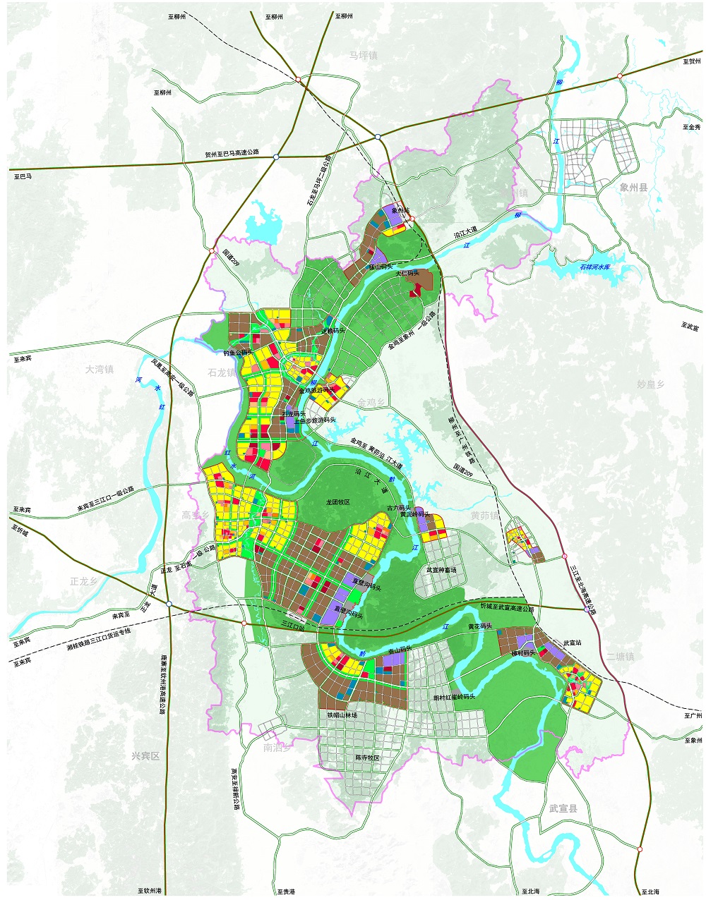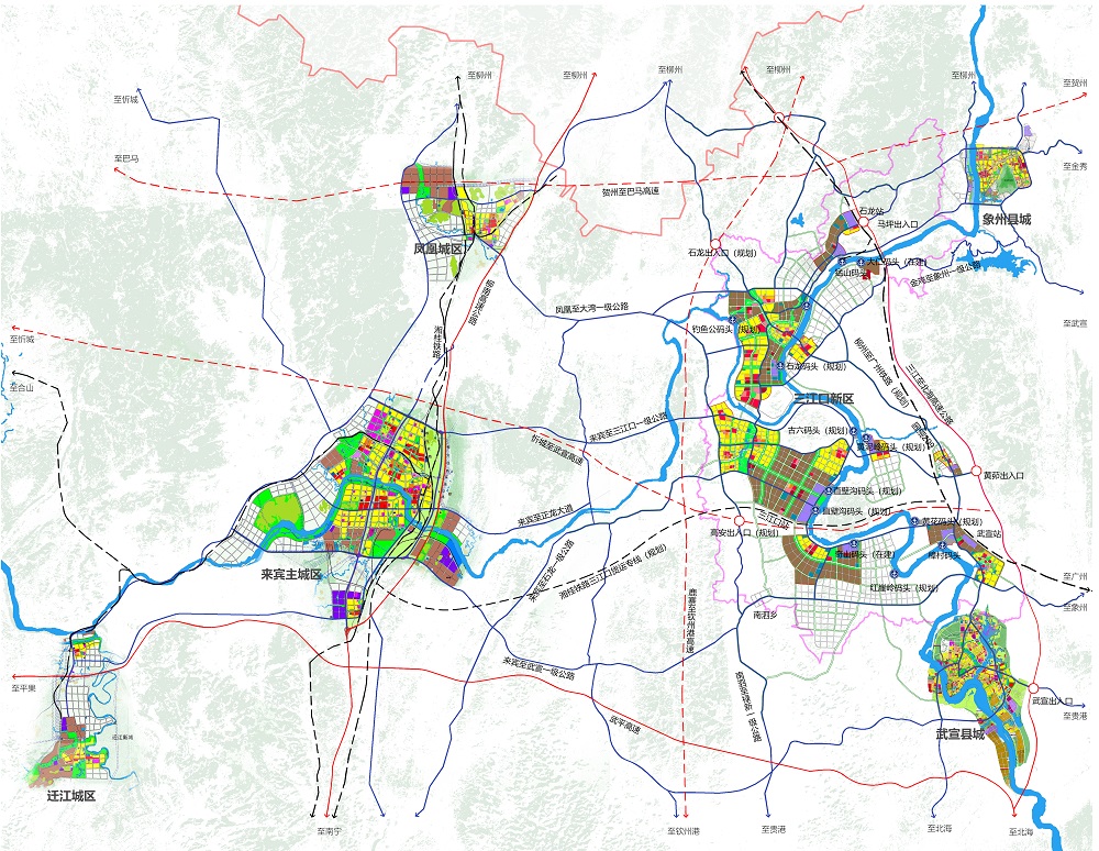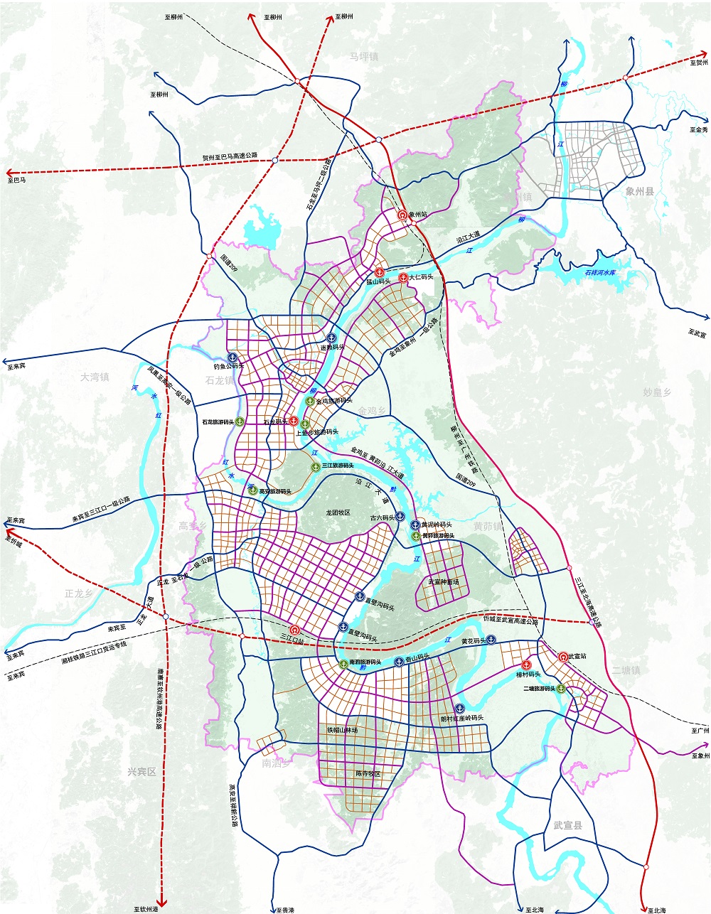 高效綜合交通系統(tǒng)規(guī)劃——以區(qū)域性交通互聯(lián)互通為突破點(diǎn),形成以港口、鐵路、公路為核心的多式聯(lián)運(yùn)對(duì)外綜合交通體系,強(qiáng)化以港口碼頭為中心建設(shè)通往柳州、河池等周邊城市以及通往粵港澳大灣區(qū)城市的黃金水道;重點(diǎn)推進(jìn)三江口新區(qū)產(chǎn)業(yè)組團(tuán)與國(guó)道209、國(guó)道355等區(qū)域性交通干道的銜接;完善以港區(qū)港口為支點(diǎn)的港產(chǎn)城融合發(fā)展體系:加快石龍碼頭、直壁溝碼頭、黃泥嶺碼頭及其配套設(shè)施的建設(shè),以港口為依托,完善集疏運(yùn)體系,促進(jìn)港口與腹地經(jīng)濟(jì)良性循環(huán)發(fā)展,驅(qū)動(dòng)新區(qū)從“碼頭經(jīng)濟(jì)”走向港產(chǎn)城融合發(fā)展。