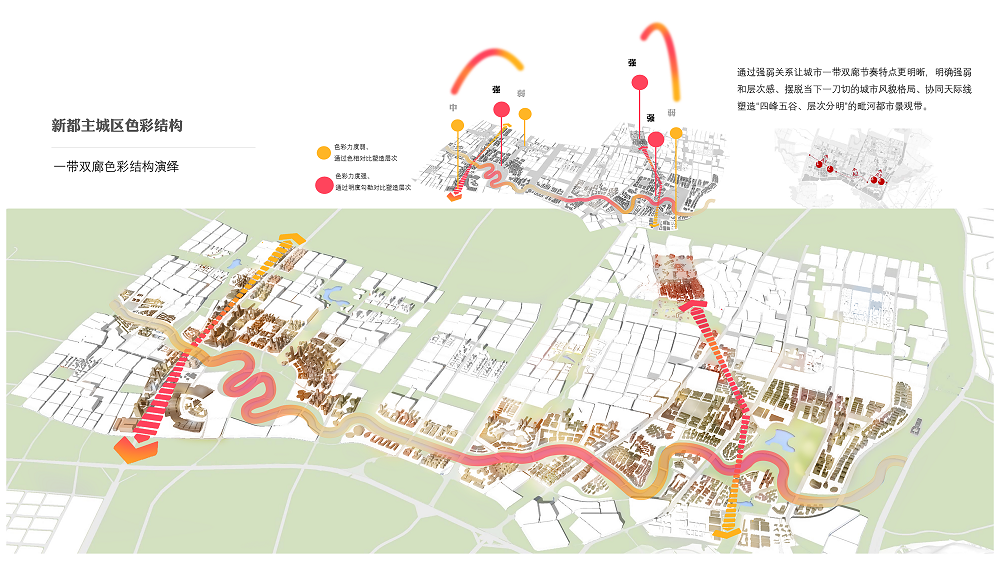 新都區(qū)城市容貌提升,是在公園城市建設(shè)背景下,追溯城市文脈、梳理城市色彩基底、尋找城市主調(diào),以城市色彩為核心,開展的系統(tǒng)性城市形象識別系統(tǒng)提升。創(chuàng)新執(zhí)行的城市色彩、戶外外擺、戶外廣告、戶外導(dǎo)視系統(tǒng),將城市以點、線、面的方式,全系統(tǒng)覆蓋,通過綜合性的治理體系及樣板段示范,建立可實施可落地的管控引導(dǎo)。