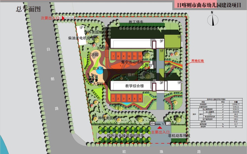 ????本項目位于日喀則珠峰開發(fā)開放試驗區(qū)教育城內(nèi),規(guī)劃為12班幼兒園,建設用地為15920.77㎡,建筑總面積為5346.21㎡,其中地上建筑面積為5156.11㎡,地下建筑面積為190.1㎡。項目用地南側(cè)為規(guī)劃道路,西側(cè)為綠化用地和規(guī)劃道路,東側(cè)和北側(cè)分別為規(guī)劃桑珠孜區(qū)第四小學和規(guī)劃園丁苑。