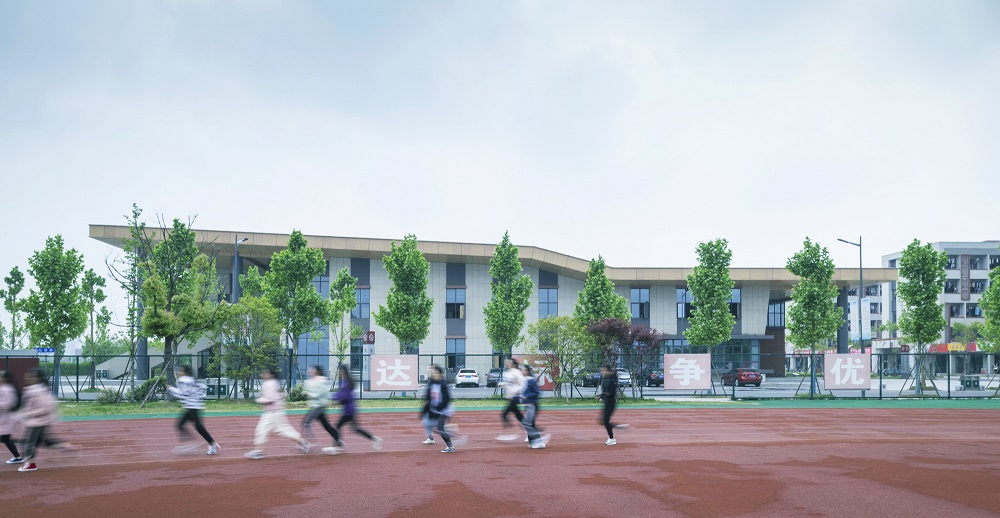 空間規(guī)劃上,打造以場地水系的改造為基礎、貫穿場地東西的創(chuàng)新軸,與主入口和湖面自然串聯的南北軸線傳承軸。建筑設計突破傳統(tǒng)教學樓與地面的簡單垂直空間關系,利用柱廊、下沉、屋頂平臺等手法,讓立體的校園空間具有了流動性和交流性,最大化豐富了學生的交流活動空間。